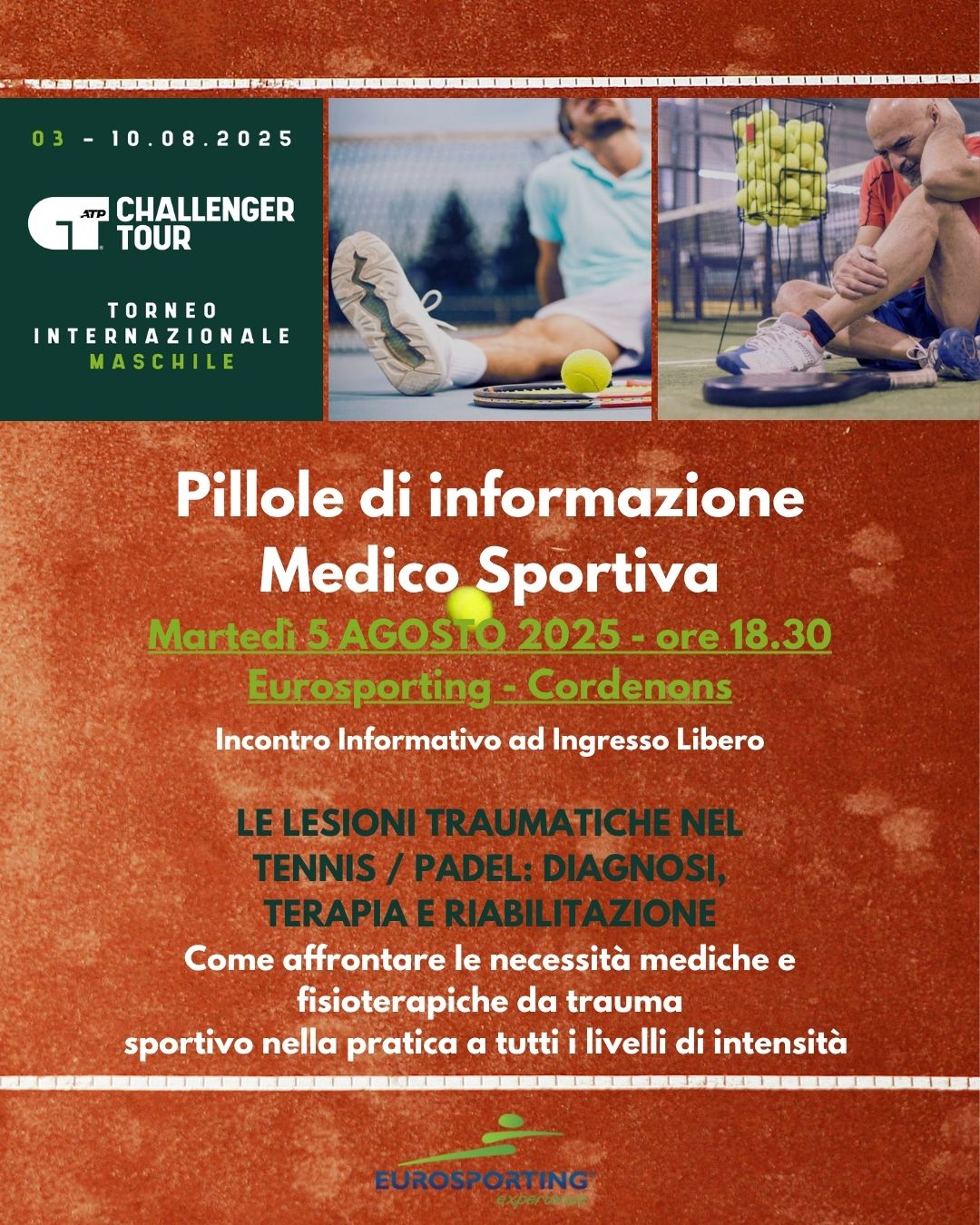 Martedì 5 agosto, presso l’Eurosporting Cordenons, in occasione del Torneo Internazionale maschile di Tennis ATP Challenger Tour, un evento collaterale informativo dal titolo “Pillole di informazione Medico Sportiva” dedicato a tutti i giocatori e giocatrici, principianti, agonisti, professionisti, tecnici, preparatori atletici ed allenatori a vario titolo di Tennis e Padel.